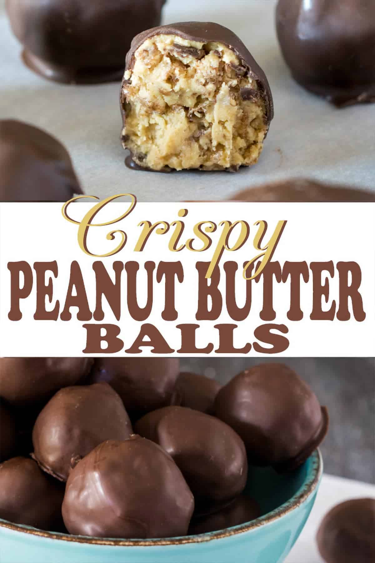 Store: Store these crunchy peanut butter balls in a cool, dry place in an airtight container. I do find that if I allow them to thaw, the chocolate will sweat as it warms up. We’ve never seen them go more than a few days, but they should last 1-2 weeks in the refrigerator.