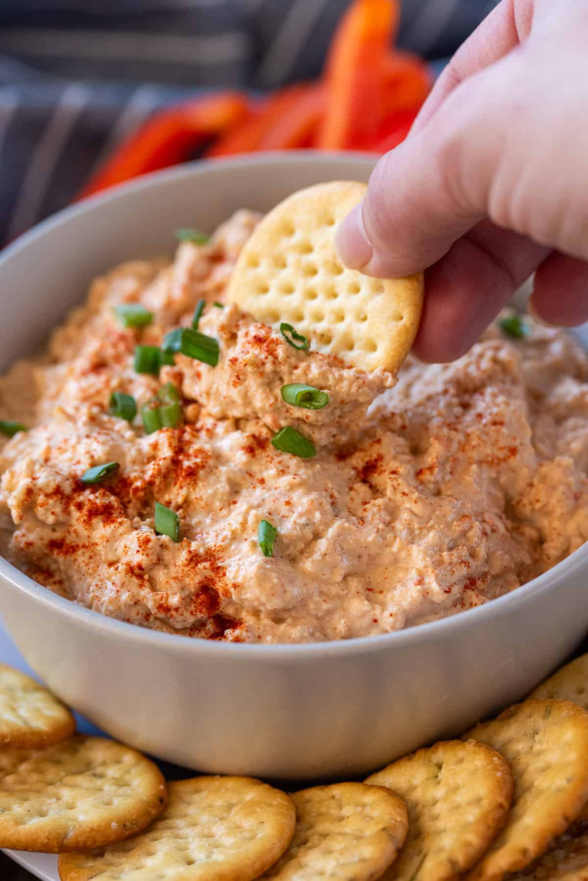 Crackers are generally the most popular, but carrot sticks, celery, pepper strips, tortilla chips, thin pretzels, and sliced baguette are also lovely. For crackers, ideal options include Ritz or Club with a hint of buttery flavor. Wheat Thins and other multigrain crackers also pair nicely.
